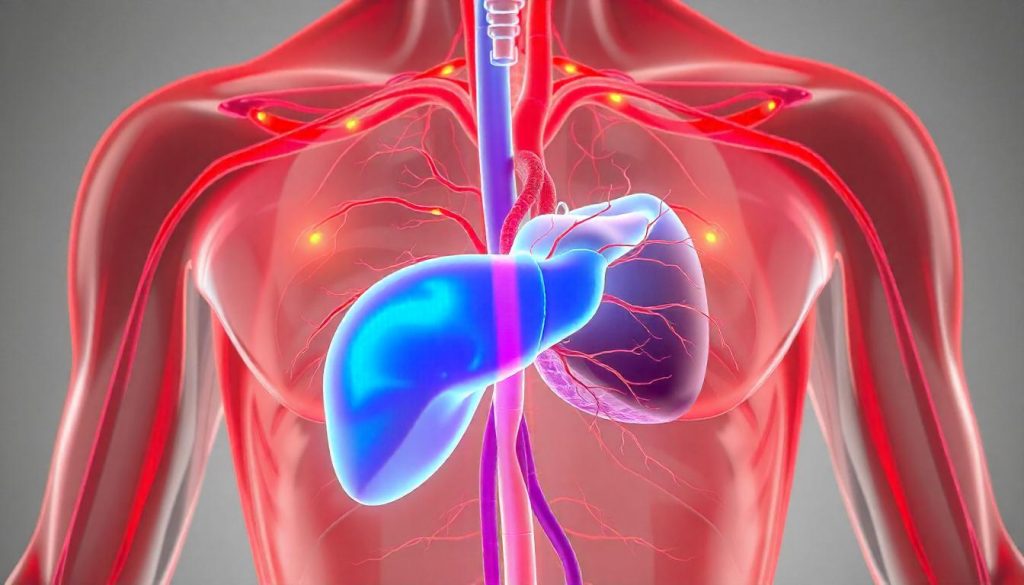 - Low blood oxygen levels via hepatopulmonary syndrome.